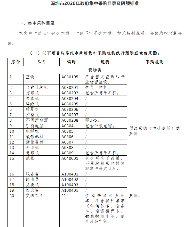 深圳市財政局關(guān)于印發(fā)《深圳市2020年政府集中采購目錄及限額標(biāo)準(zhǔn)》的通知